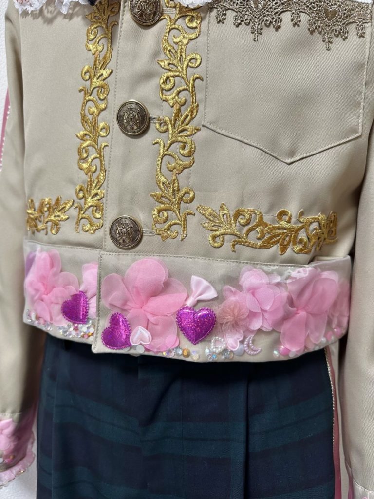 裾と袖口に、メンバーカラーのお花、ハート、キラキラ等のミックスパーツが動くたびに移動する、という面白いデザイン
